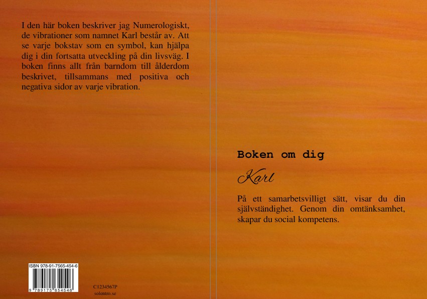 I den här boken beskriver jag Numerologiskt de vibrationer som namnet Karl består av. Att se varje bokstav som en symbol, kan hjälpa personen i sin fortsatta utveckling på sin livsväg. I boken finns allt från barndom till ålderdom beskrivet, tillsammans med positiva och negativa sidor av varje vibration.