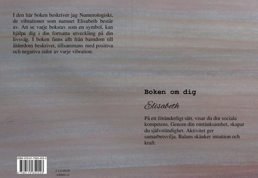 I den här boken beskriver jag Numerologiskt, de vibrationer som namnet Elisabeth består av. Att se varje bokstav som en symbol, kan hjälpa dig i din fortsatta utveckling på din livsväg. I boken finns allt ifrån barndom till ålderdom beskrivet, tillsammans med positiva och negativa sidor av varje vibration.